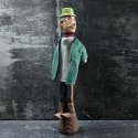 Marionnette sur socle en bois sculpté cannelé. Robe en cretonne, chignon en laine et marguerites brodées. Tête en papier mâché.