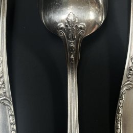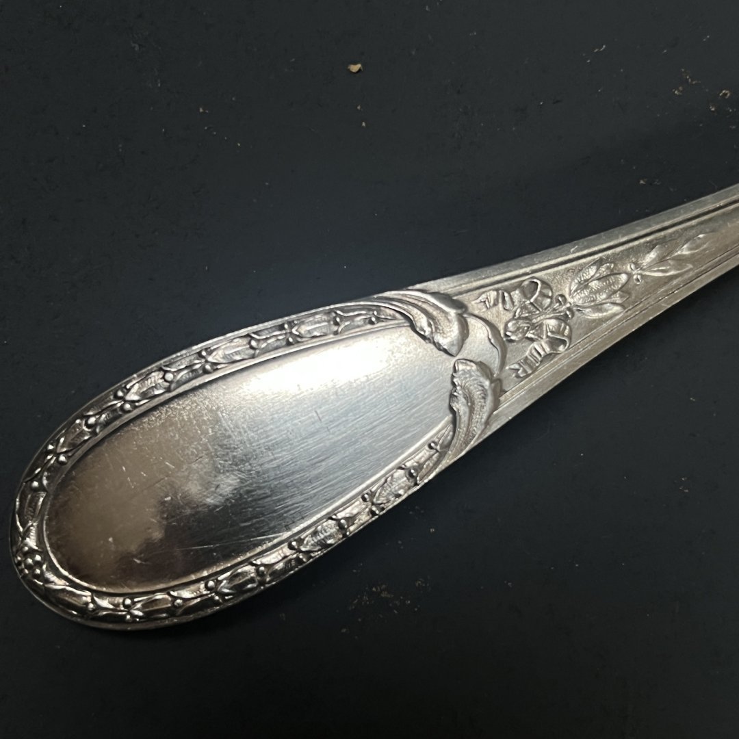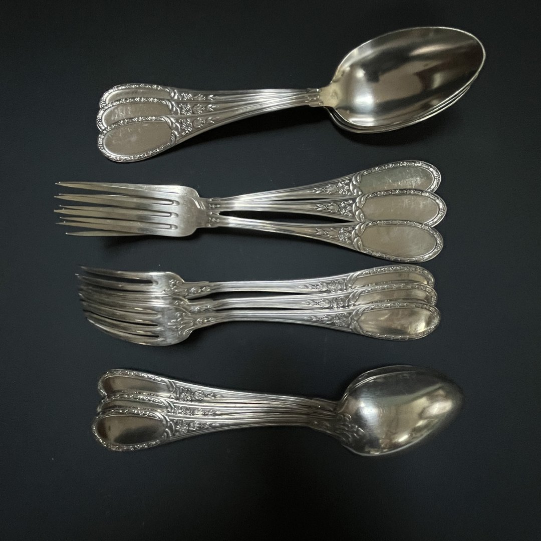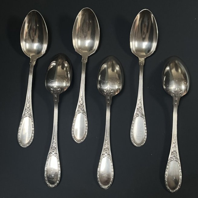 Ménagère ancienne modèle Louveciennes en métal argenté comprenant six cuillers à soupe aux décors floral remontant sur le dos 2 poinçons.