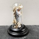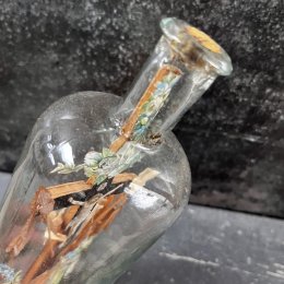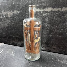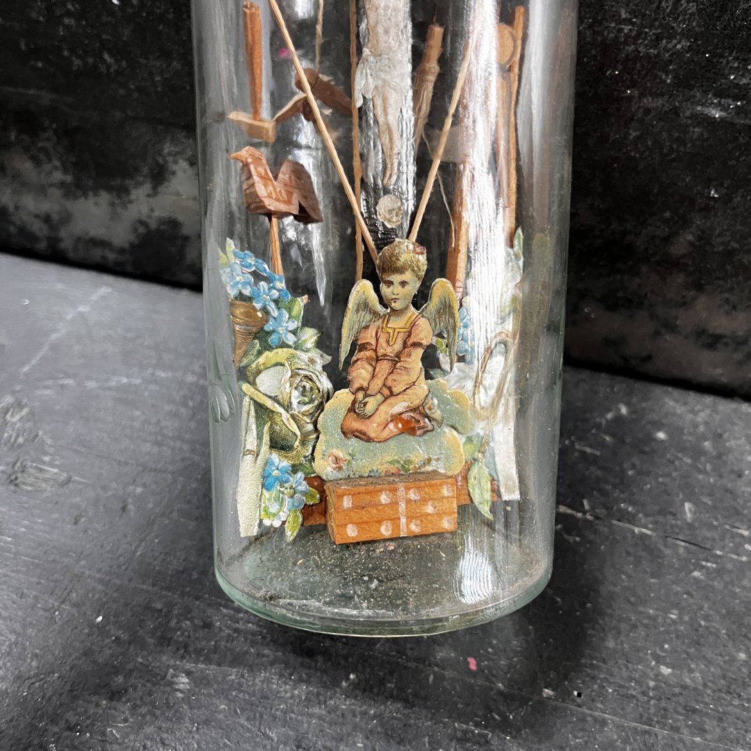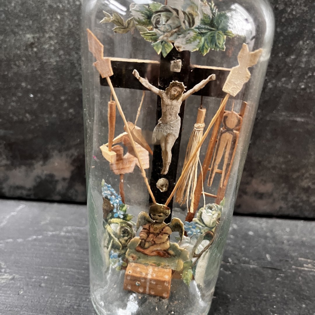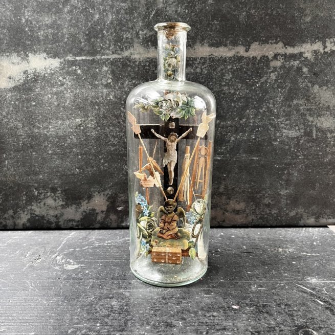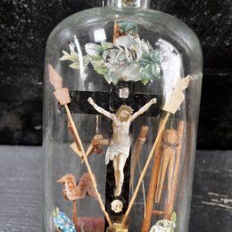 Objet de dévotion à la fabrication mystérieuse consistant à faire entrer une sculpture et des images religieuses dans une bouteille, ici la scène de la crucifixion au pied de laquelle un ange prie entouré des objets traditionnels du supplice.