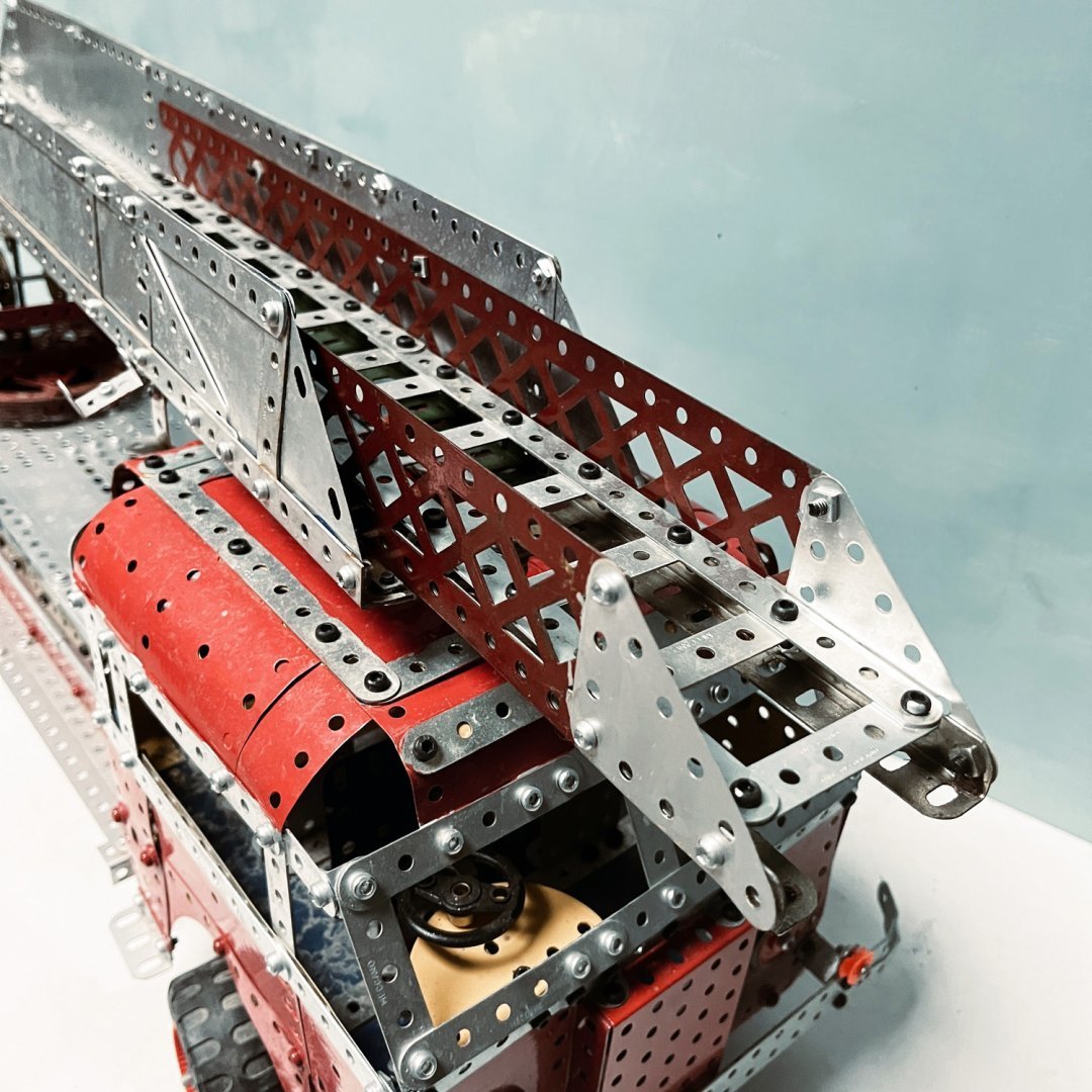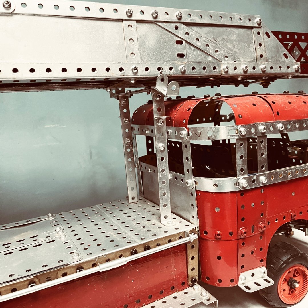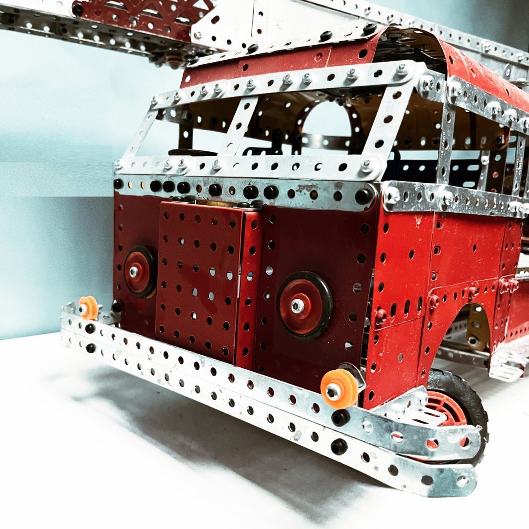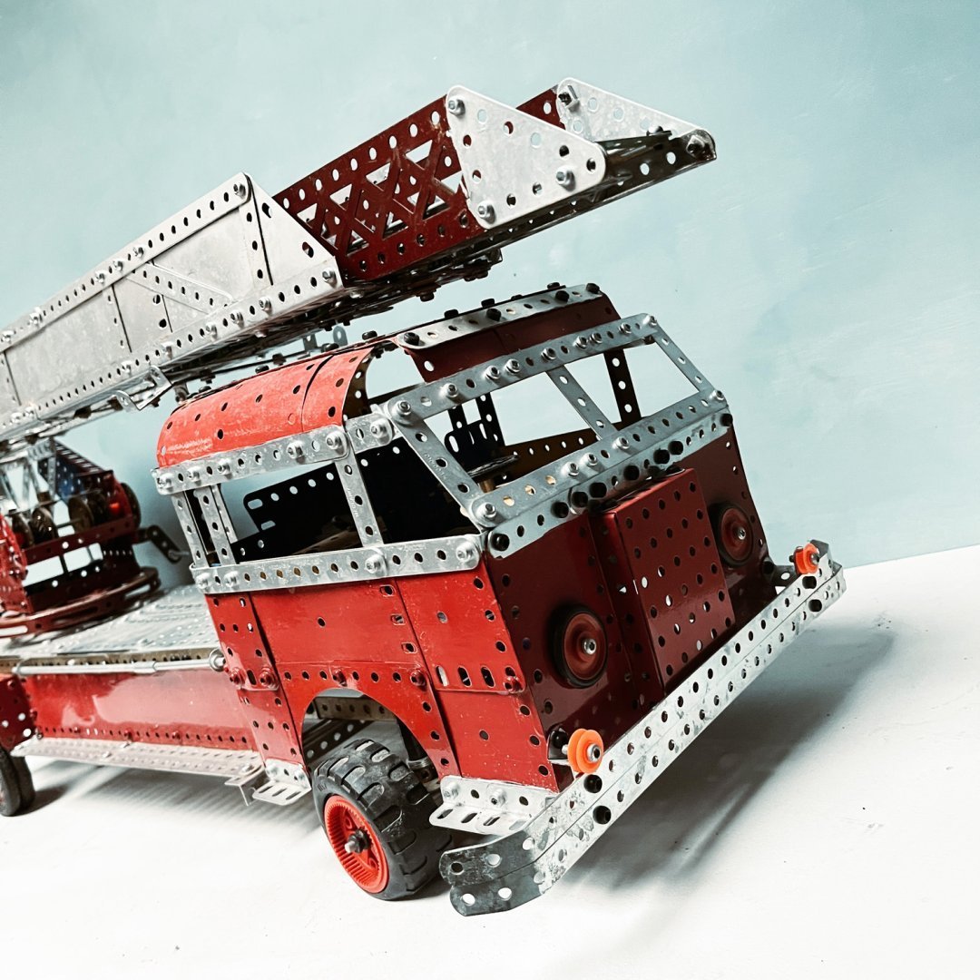 Iconique camion de pompiers MECCANO (1975?), jouet de construction en métal à pièces interchangeables, fondé sur le système des trous équidistants, inventé par F. Hornby et dont la fabrication a cessé en 2024. Une pépite pour spécialistes et collectionneurs.