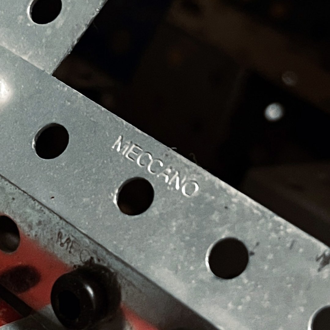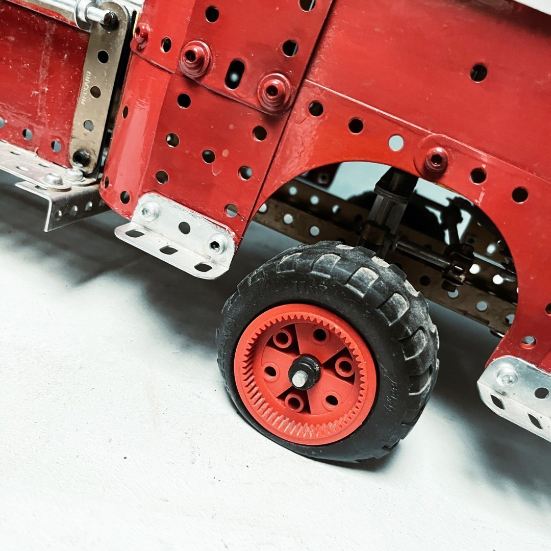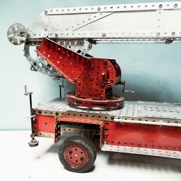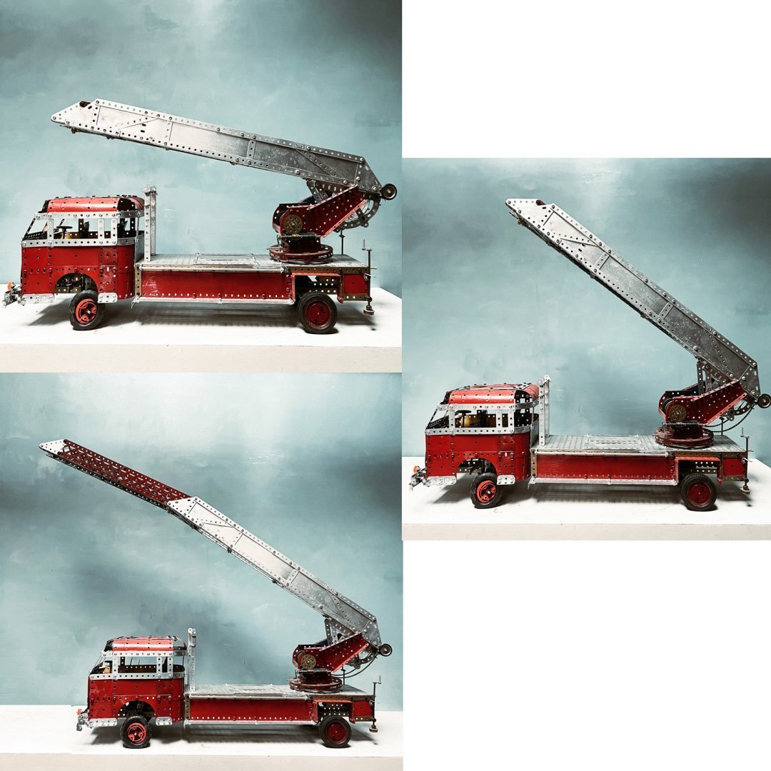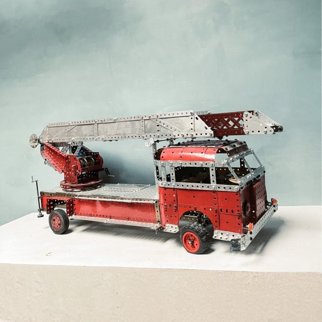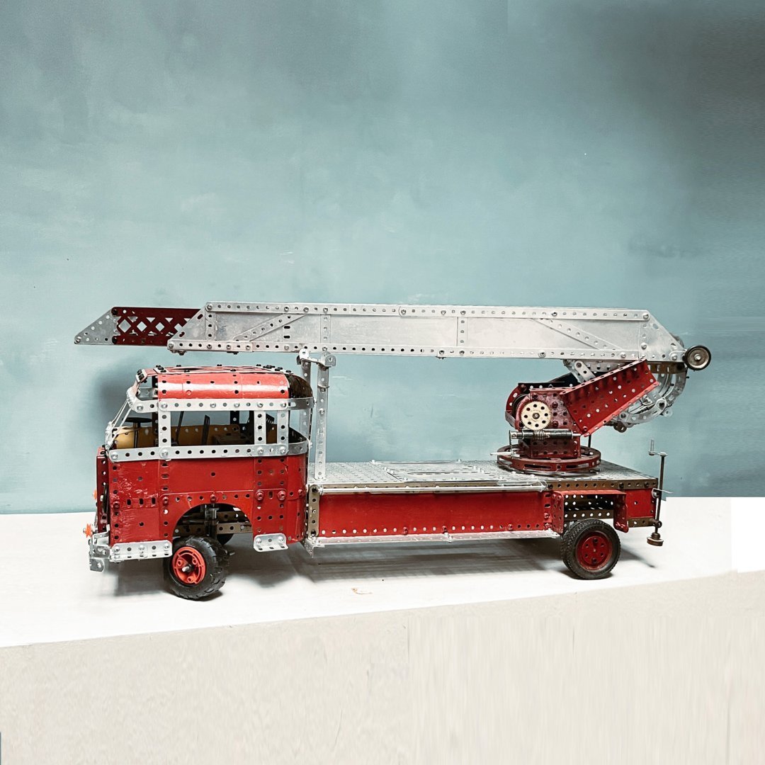 Iconique camion de pompiers MECCANO (1975?), jouet de construction en métal à pièces interchangeables, fondé sur le système des trous équidistants, inventé par F. Hornby et dont la fabrication a cessé en 2024. Une pépite pour spécialistes et collectionneurs.