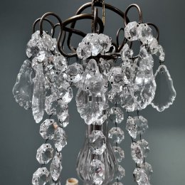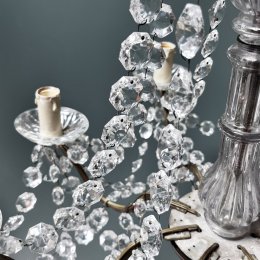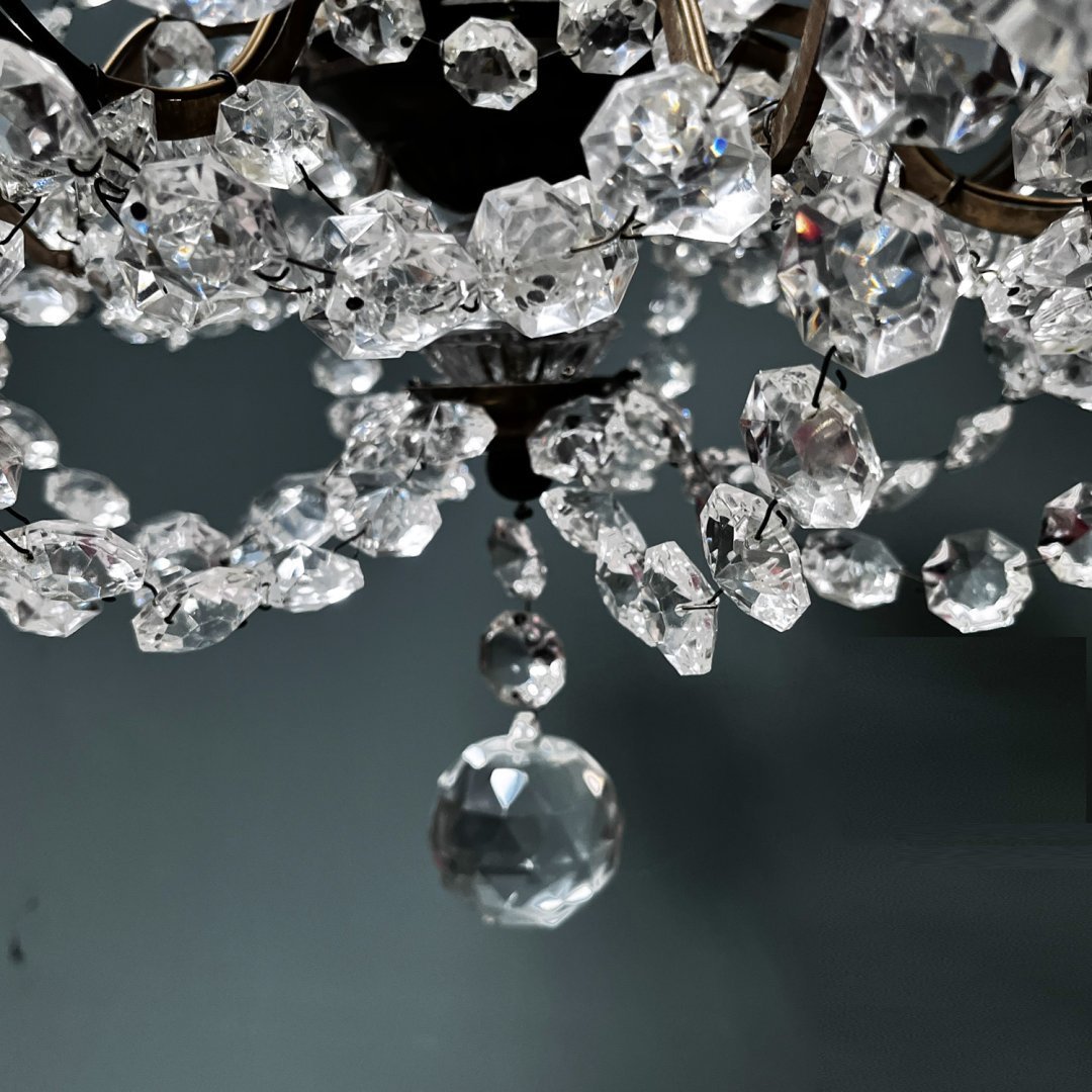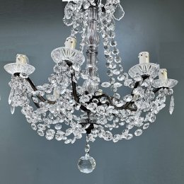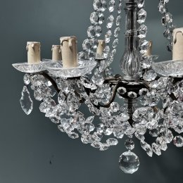 Lustre ancien au port imposant 8 bougies, très généreusement fourni en pampilles de verre biseautées, et de cascades de colliers tressés. Branches en laiton. Un bijou pour votre plafond!