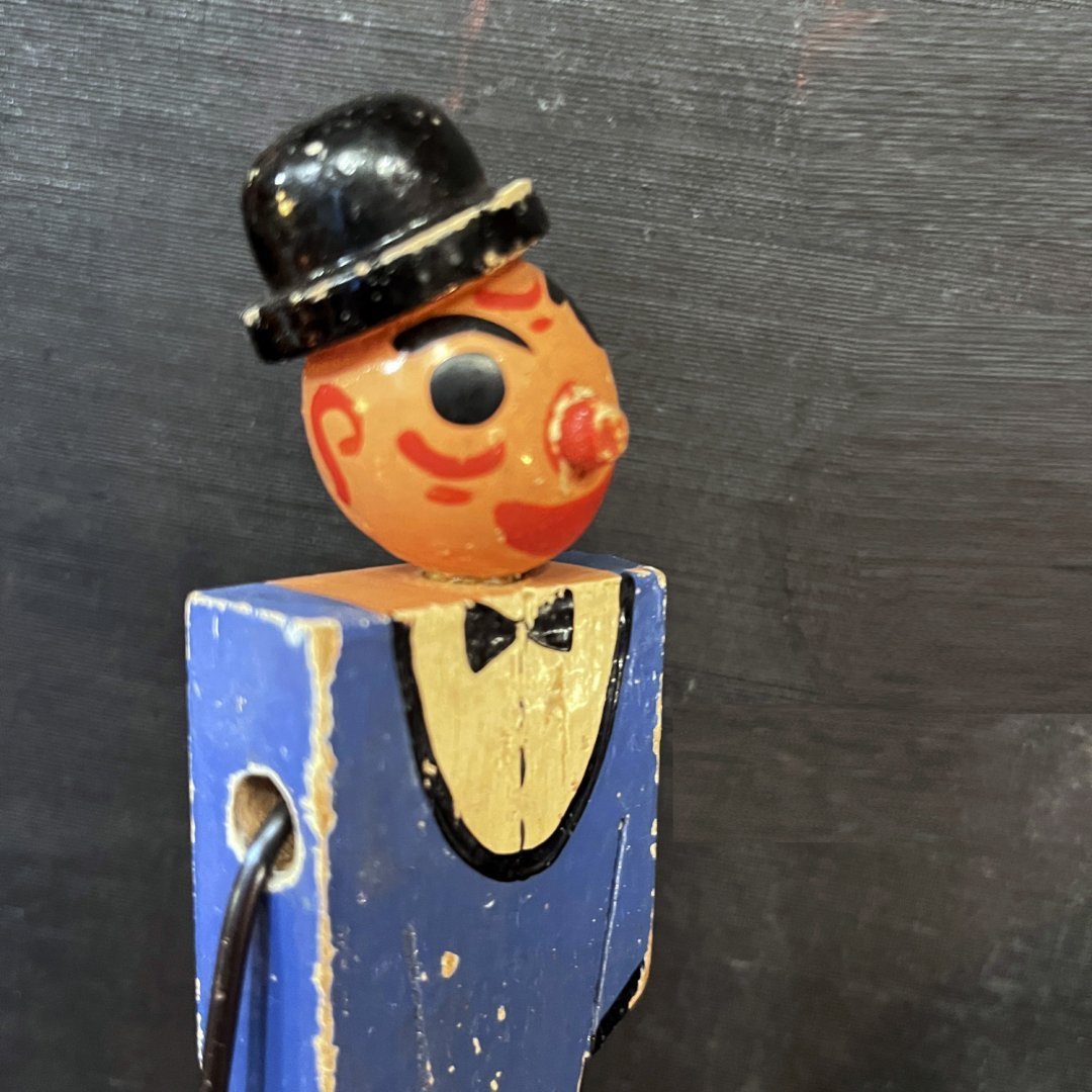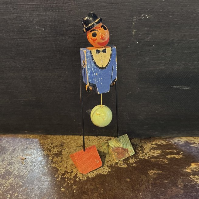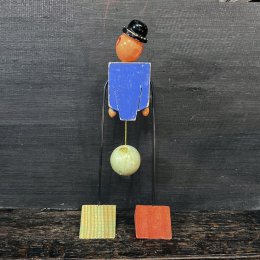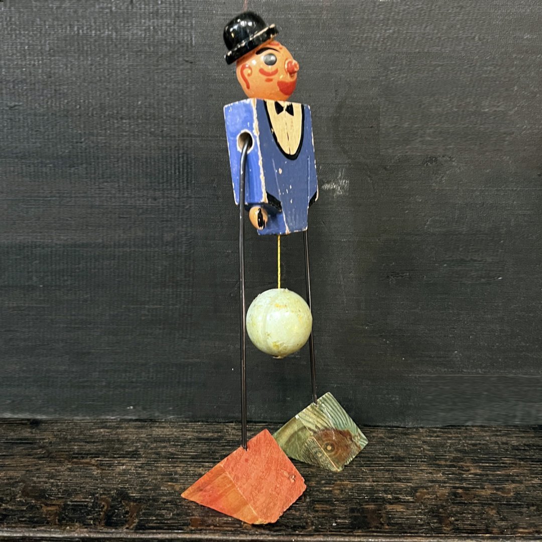Jeu clown balancier ancien en bois peint. Fixé par deux tiges en métal et lesté par une boule en bois, le personnage se balance avec grâce pour un instant suspendu. Un Jeu simple et poétique.