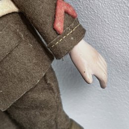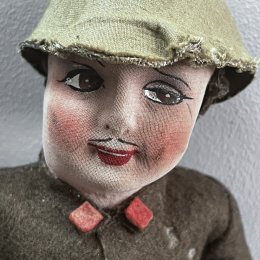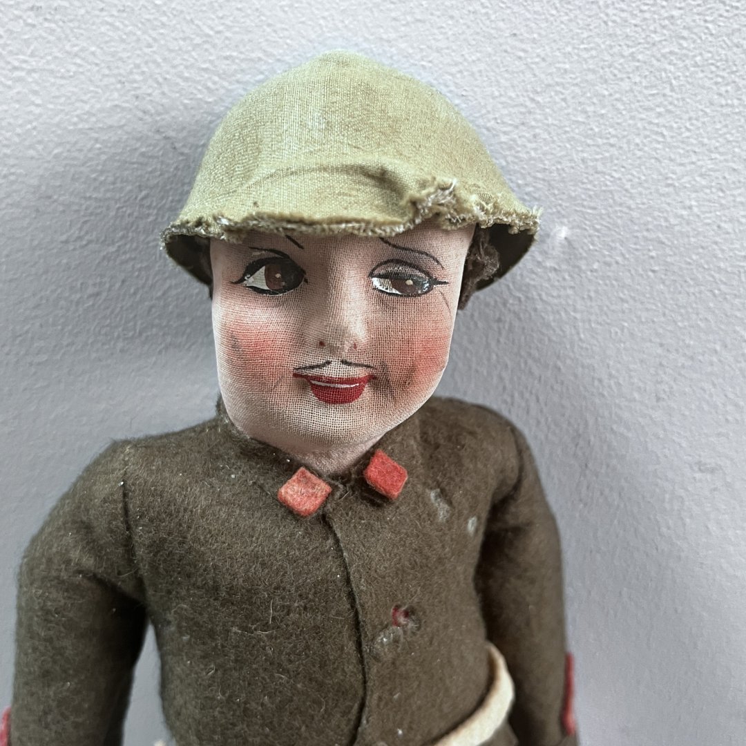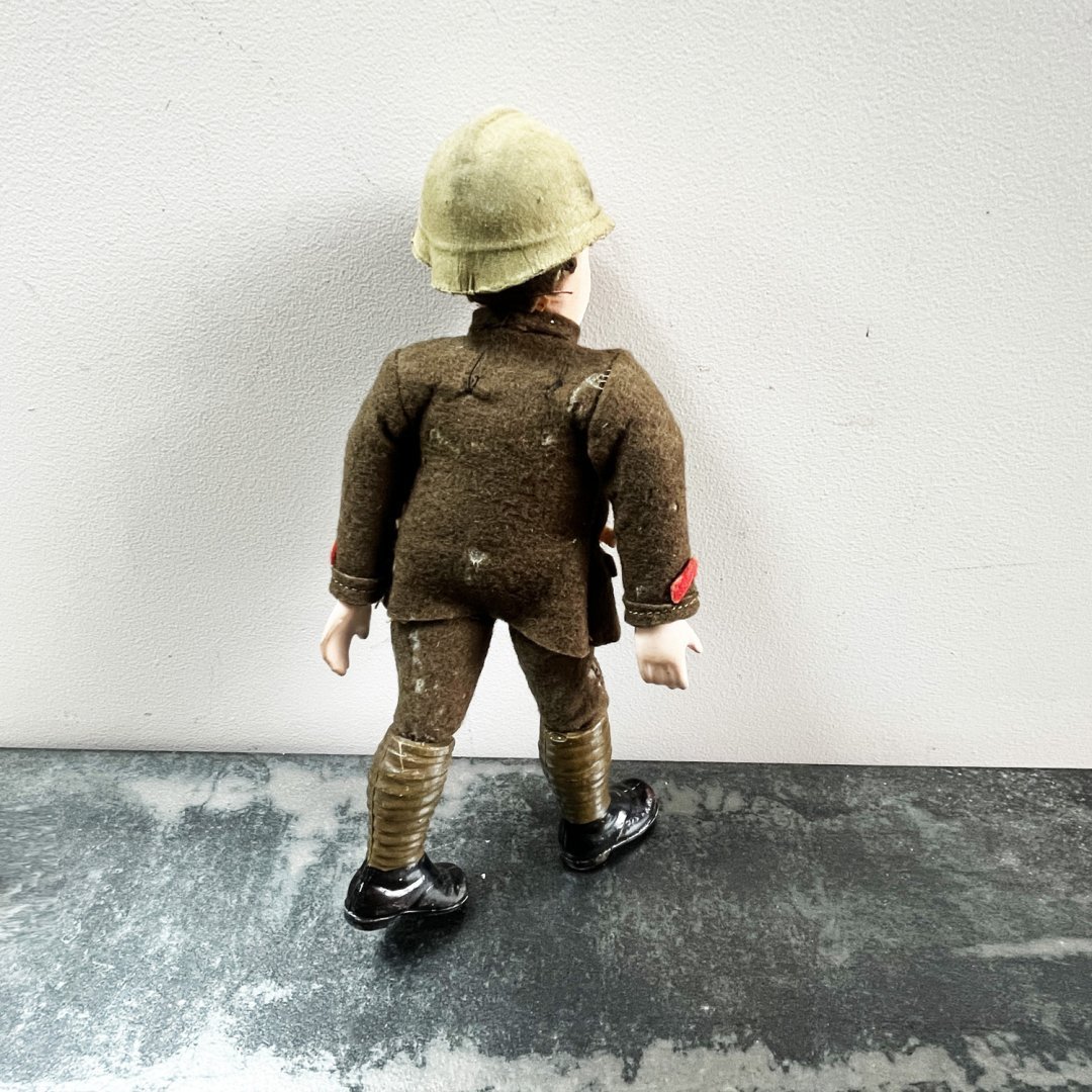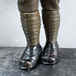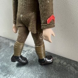 Jouet soldat anglais années 30. Poupon au visage en carton peint entoilé. Ses vêtements sont en feutrine, ses mains, ses chaussures et ses guêtres en plastique moulé.