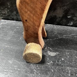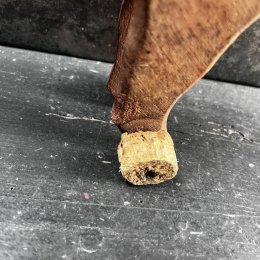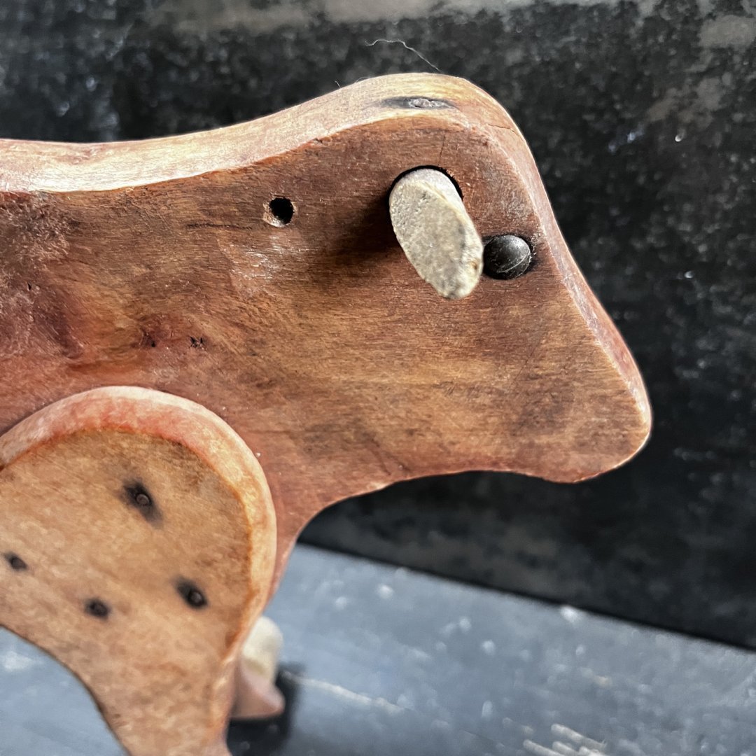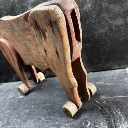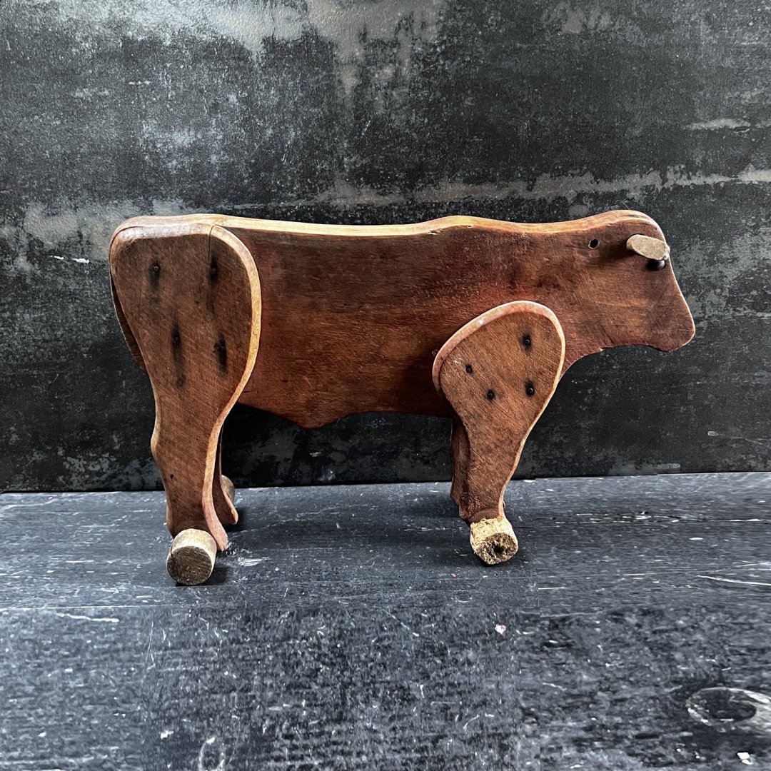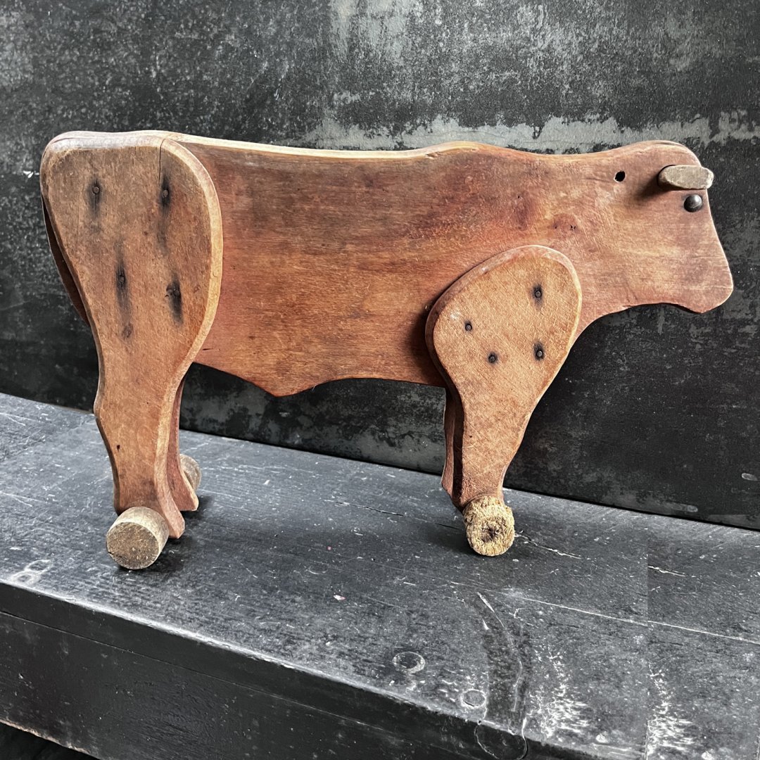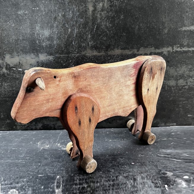 Vache en bois au dessin minimaliste et expressif. Ses yeux sont des clous plats en métal. Elle est montée sur roulettes dont une est un peu usée.