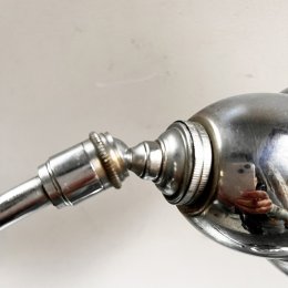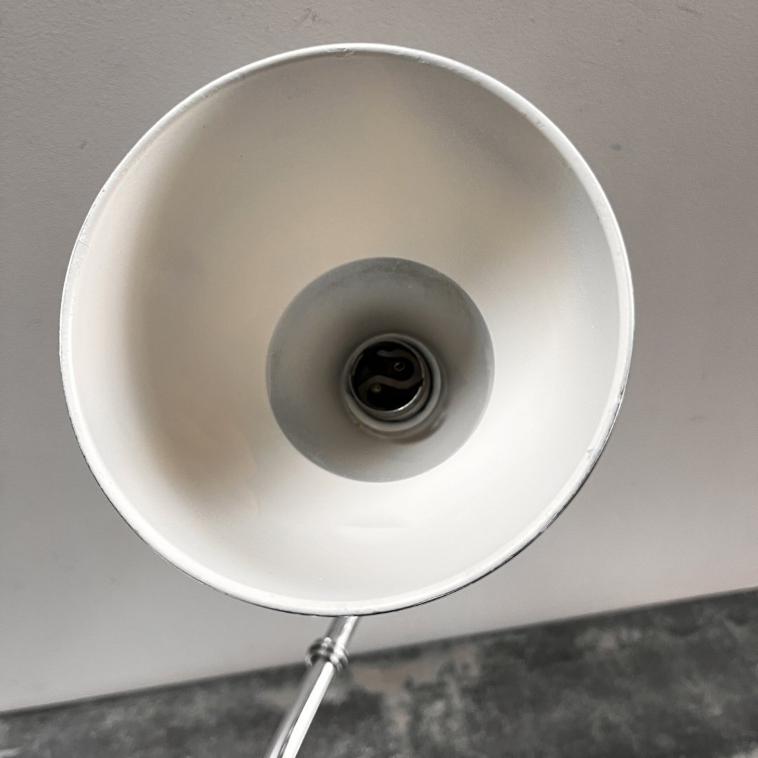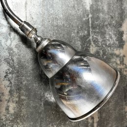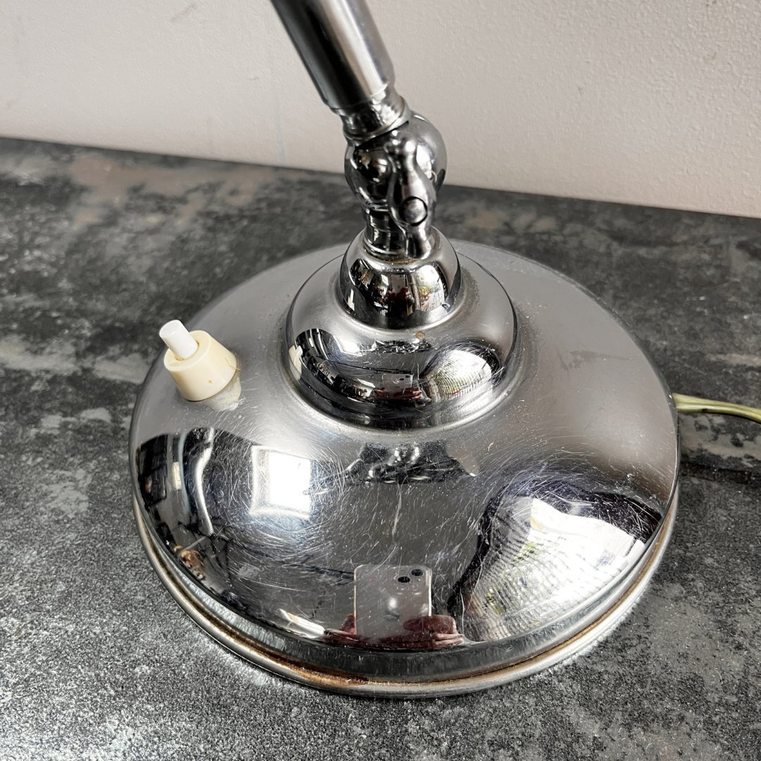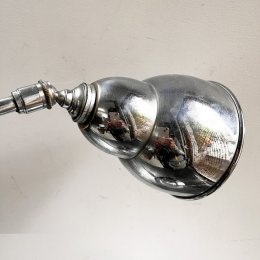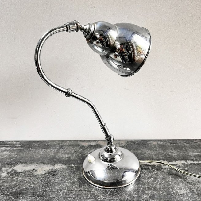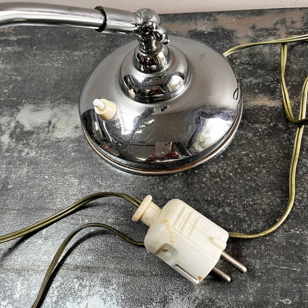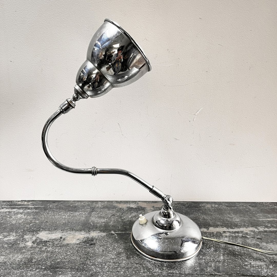 Lampe de bureau en inox Art Deco, coudée en forme col de cygne, articulée à la base et au niveau du réflecteur. A ces deux endroits les rotules fonctionnent et se règlent par une vis papillon.