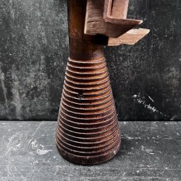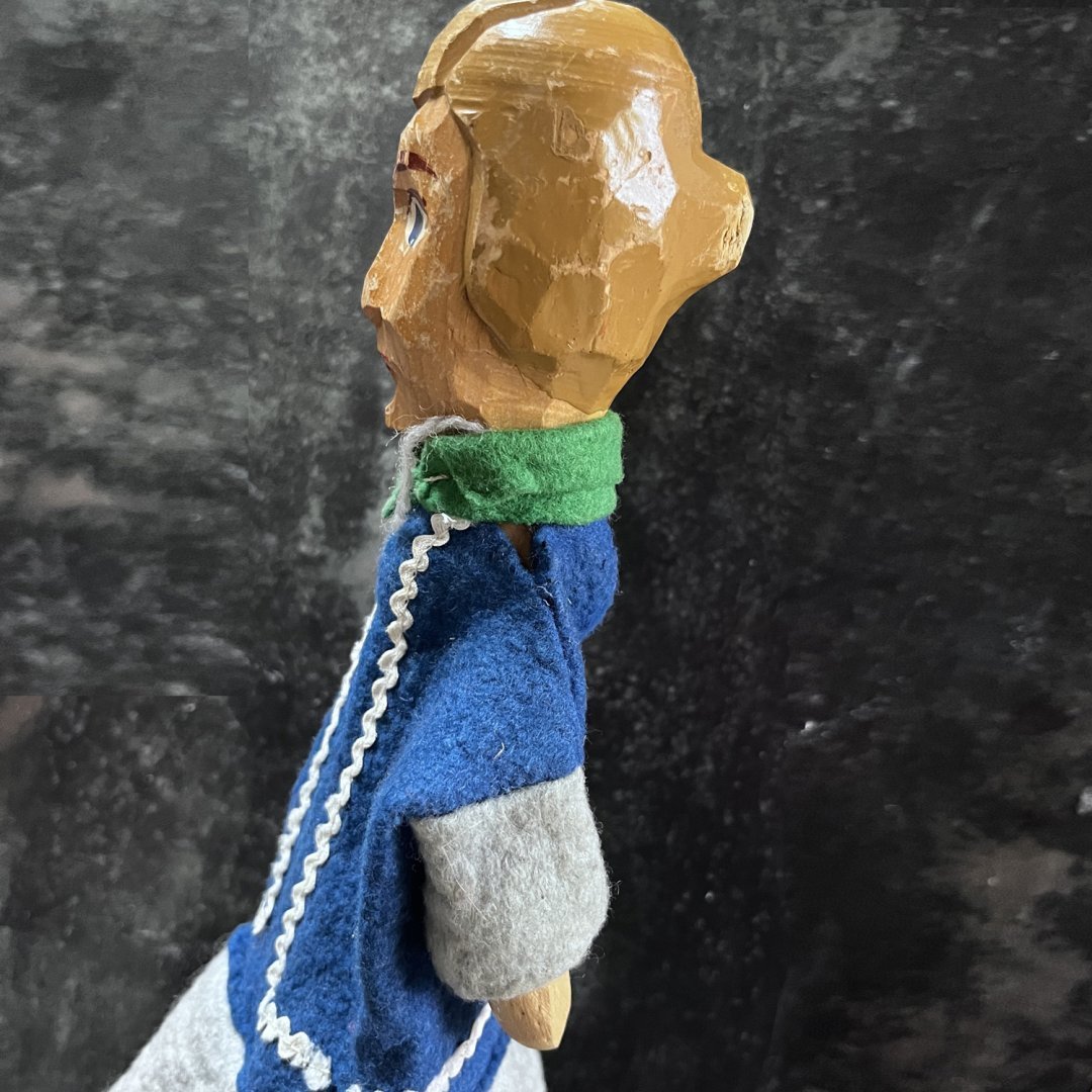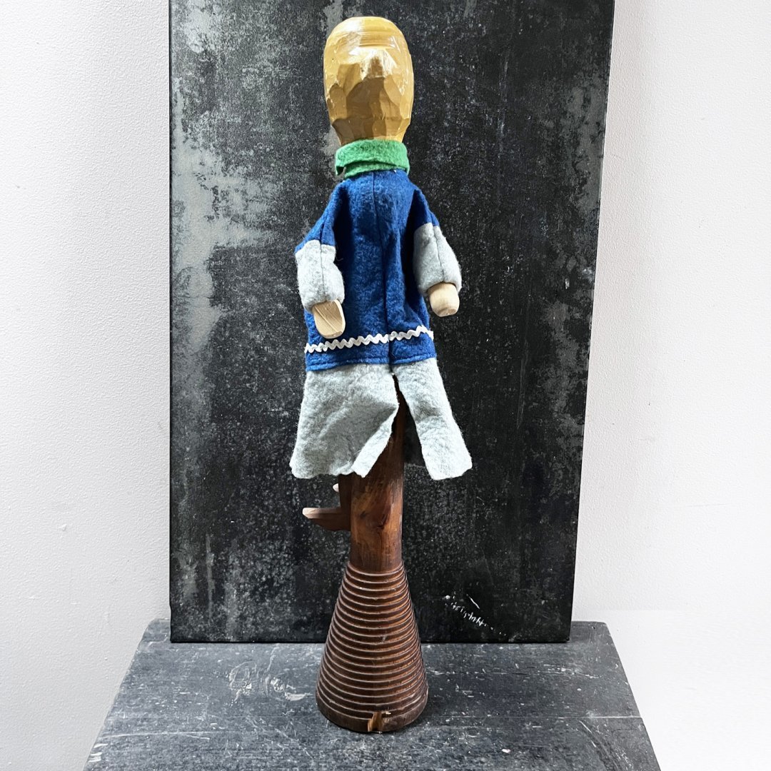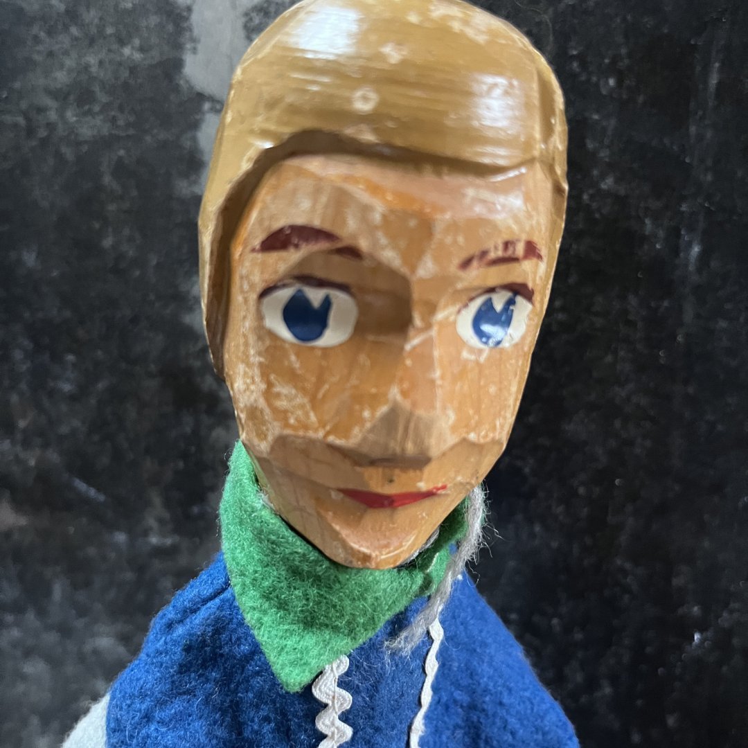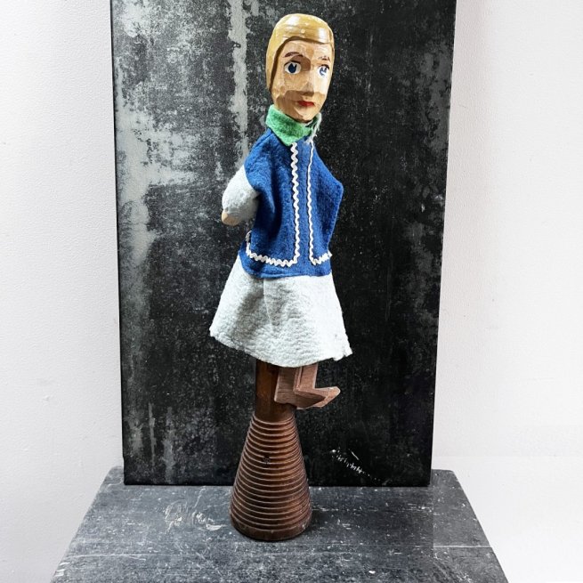 Marionnette ancienne la fille au foulard vert. Sa tête, ses mains et ses pieds sont en bois peint, ses vêtements en feutrine. Le socle est en bois tourné.