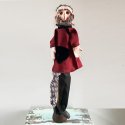 Marionnette ancienne soclée, tête et mains en bois sculpté et peint aux traits naïfs, vêtu de coton et de feutre.