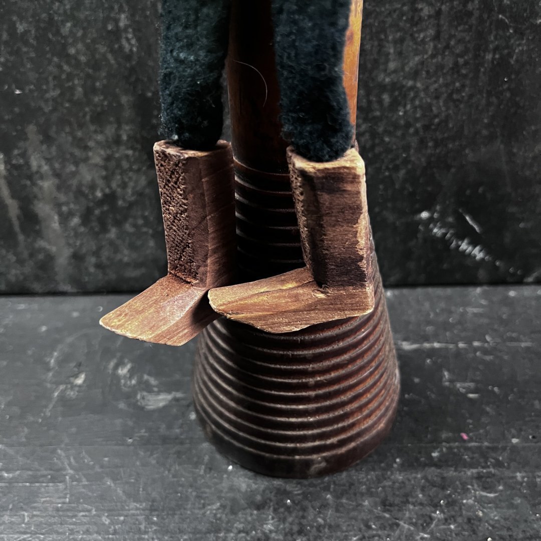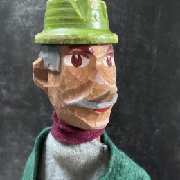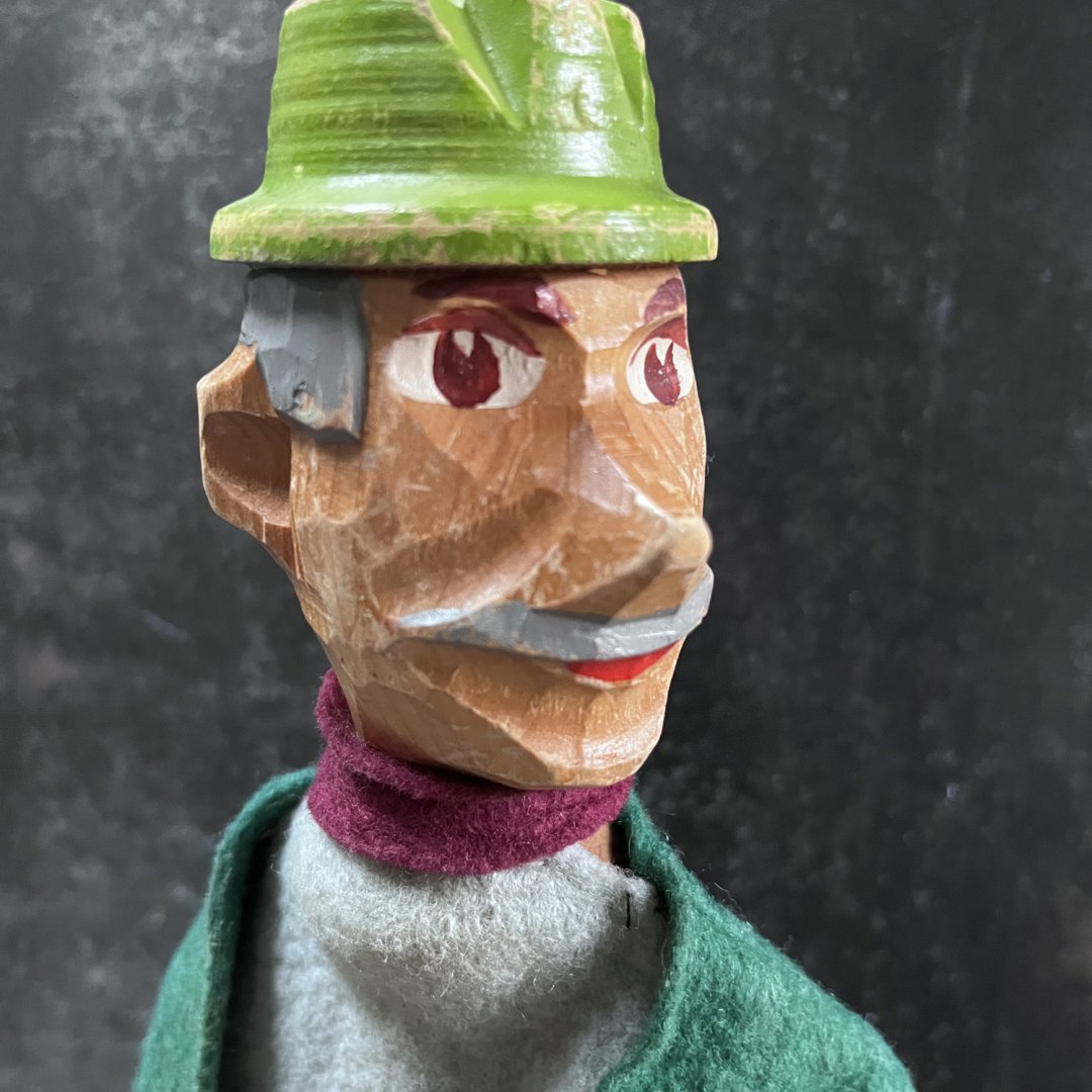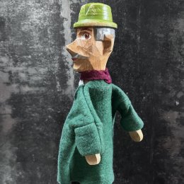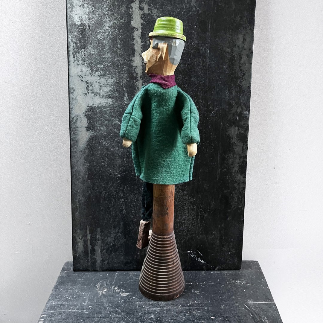Marionnette ancienne l'homme au chapeau vert. Tête, mains et pieds en bois, vêtements en feutrine. le socle rond est en bois tourné.