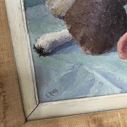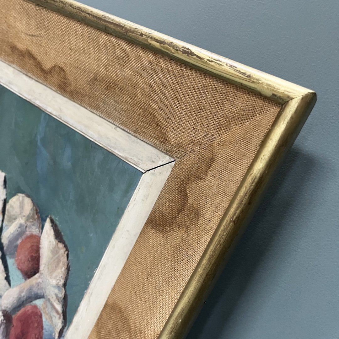 L’oeuvre, une nature morte impressionniste, peinte dans les années 30, est en bon état. Son cadre en baguette dorée vraisemblablement postérieur dont la marie-louise en jute a subi des dommages ( humidité ). Étonnamment grâce à sa teinte naturelle on peut considérer qu’il peut être conservé ou reteint.