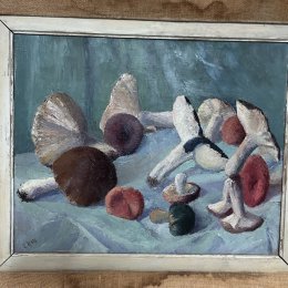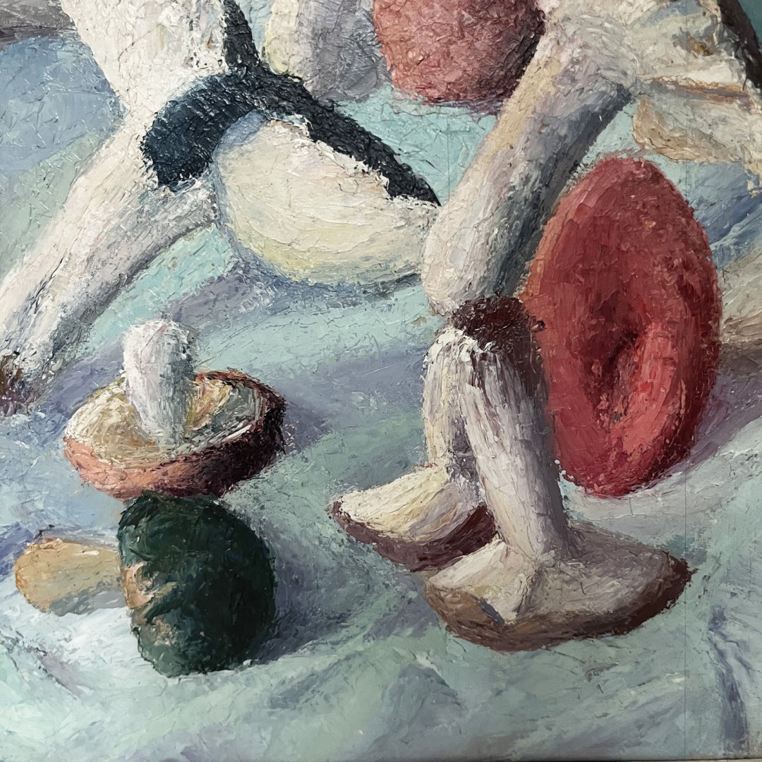 Huile sur panneau signée E.LEAS, retour de cueillette de champignons réalisée dans une palette sophistiquée privilégiant l’aspect plus artistique que naturaliste pour une oeuvre plus originale.