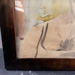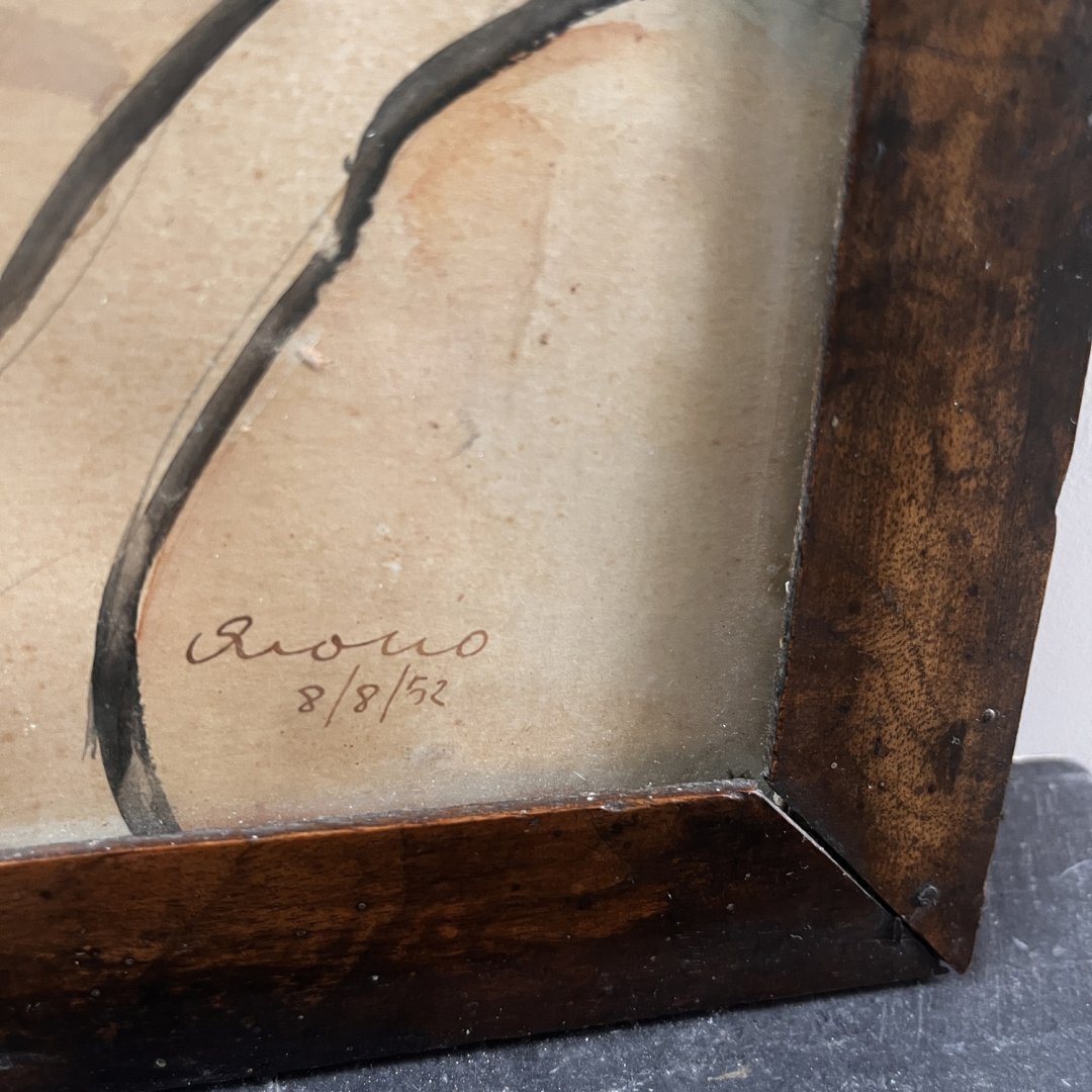 La signature semble être Rocco, mais reste à déchiffrer. Le cadre droit en bois sombre supporte une vitre en plexiglas.
