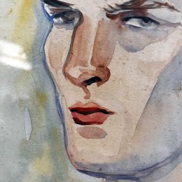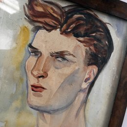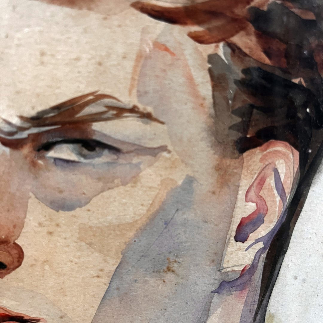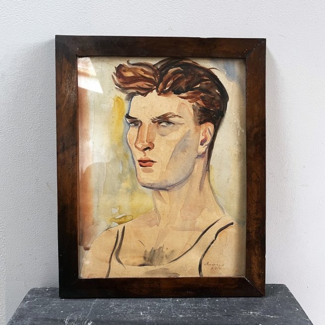 Aquarelle 1952 sur papier fort. Portrait signé d’un jeune homme au regard insolent vêtu d'un marcel. Provient de la collection personnelle de Michou, célèbre homme de spectacle et de cabaret transformiste de la Butte Montmartre.