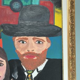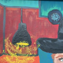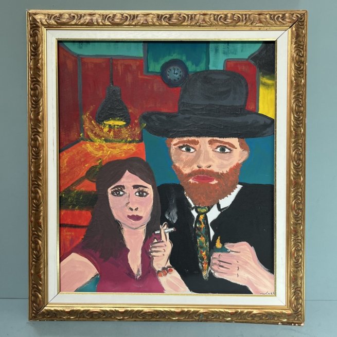 Huile sur toile aux volumes généreux signé Tabbri, années 80: scène de café, couleurs festives et style naïf soulignent l’esprit convivial de cette rencontre autour d’un briquet.