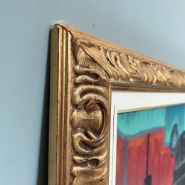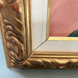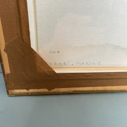 Le choix d’un cadre en bois aux volutes dorées souligné d’une marie-louise blanche marque la volonté de porter le tableau à sa dimension artistique plus qu’anecdotique.