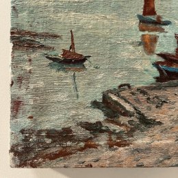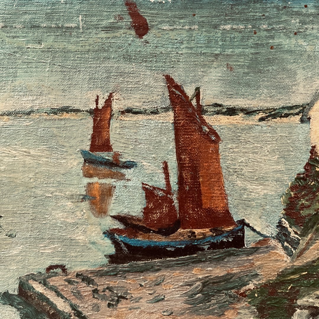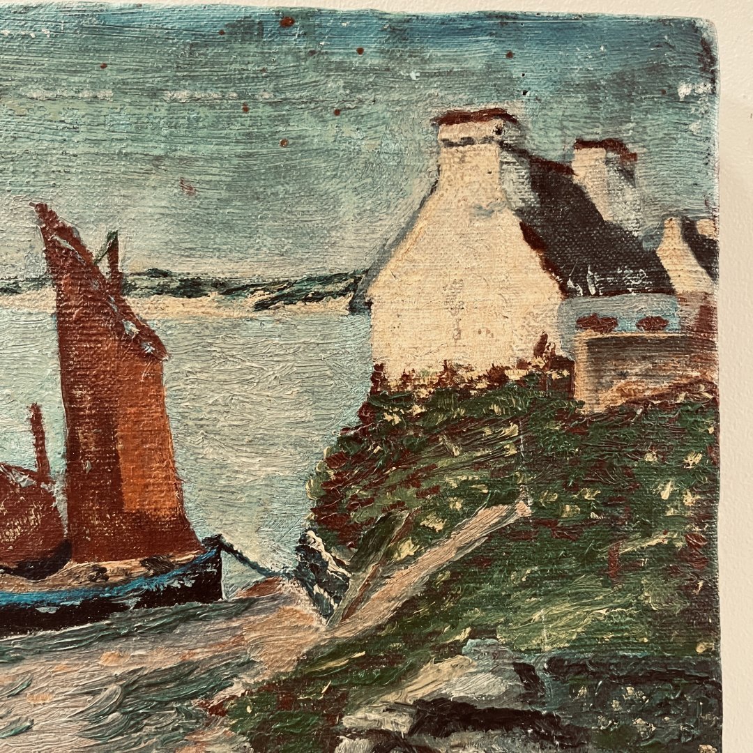 Bord de mer breton réalisé dans un style très coloré presque naïf. La peinture généreuse, le support en lin et la fabrication artisanale du châssis en bois, accentuent l'effet charmant et authentique de rusticité du sujet.