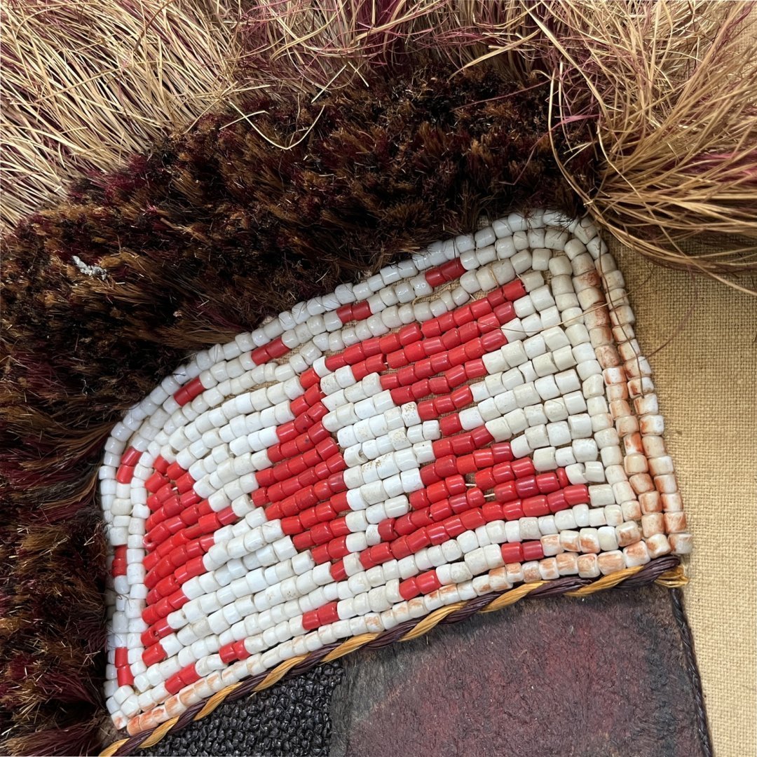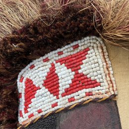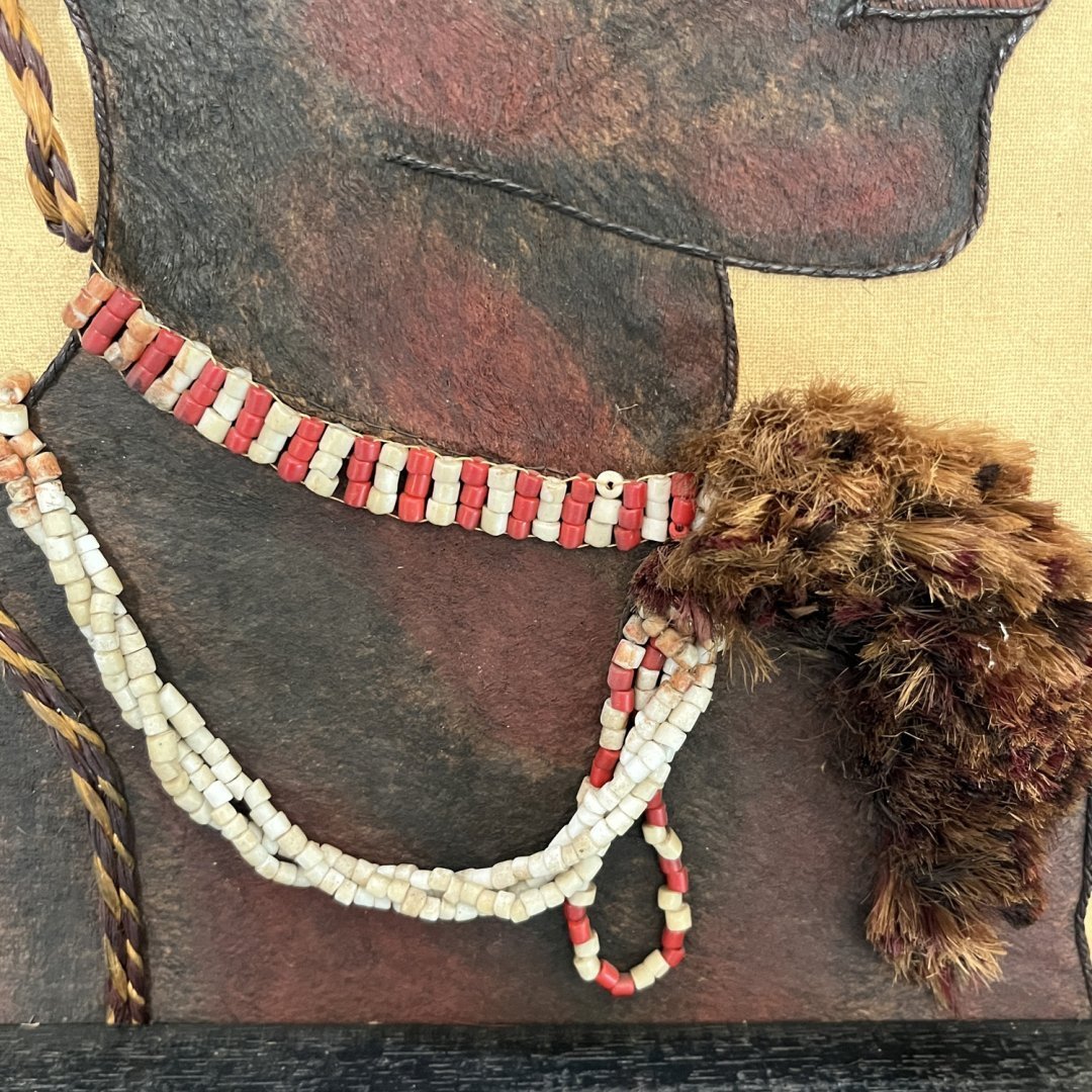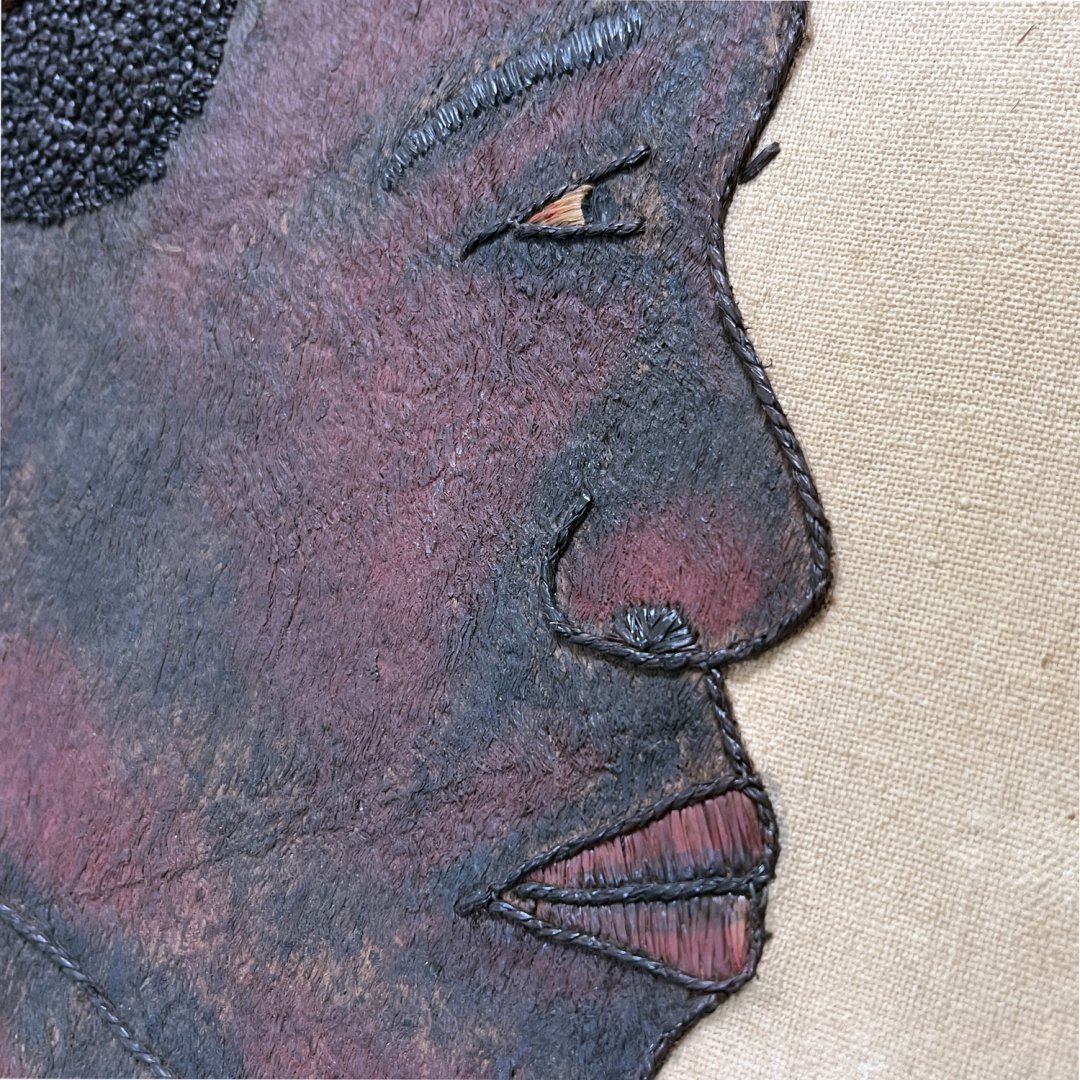 Portrait d'homme technique mixte sur jute alliant des aplats de fibres teintées aux contours de cordonnets, de tresses de raphia teinté, de crin et de perles. Tons de terre et matières naturelles authentiquement africain.