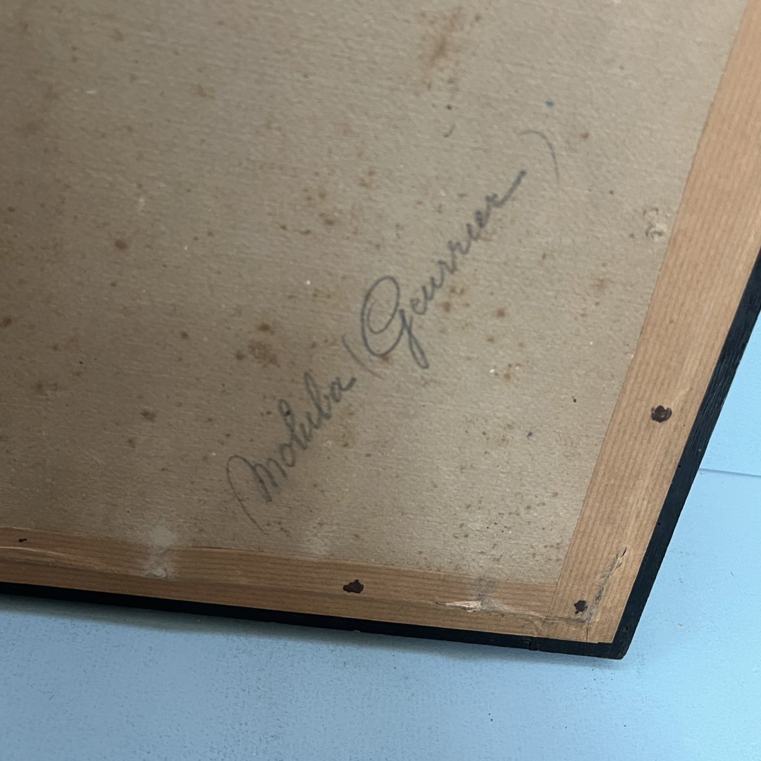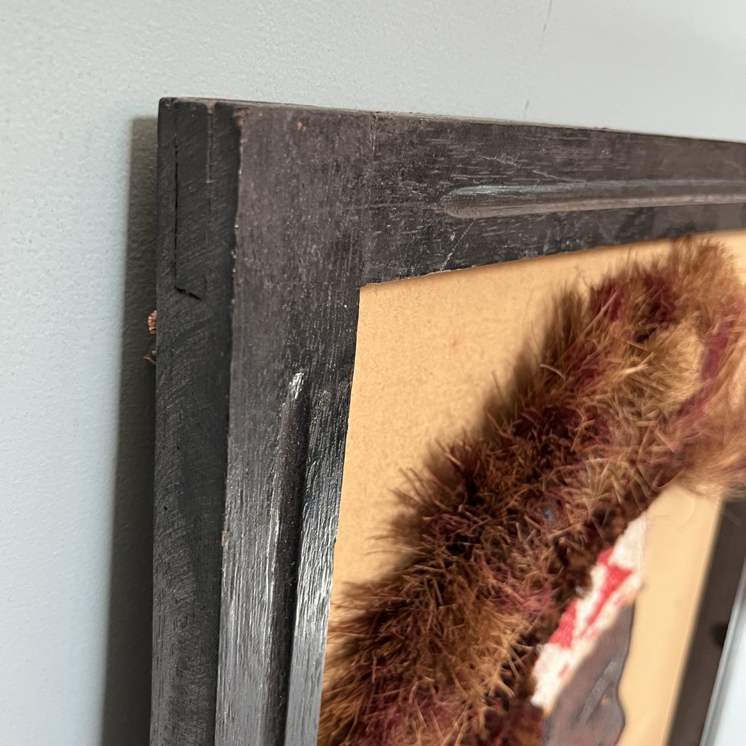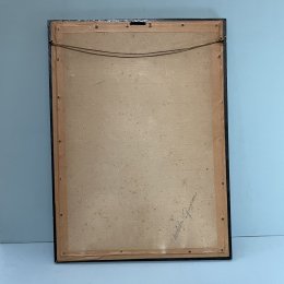 Le tableau est simplement encadré d’un cadre en bois noir à nervure, la toile est adossée à un carton.