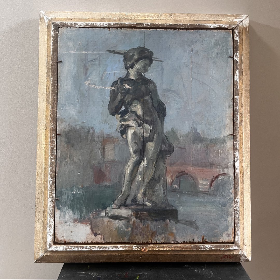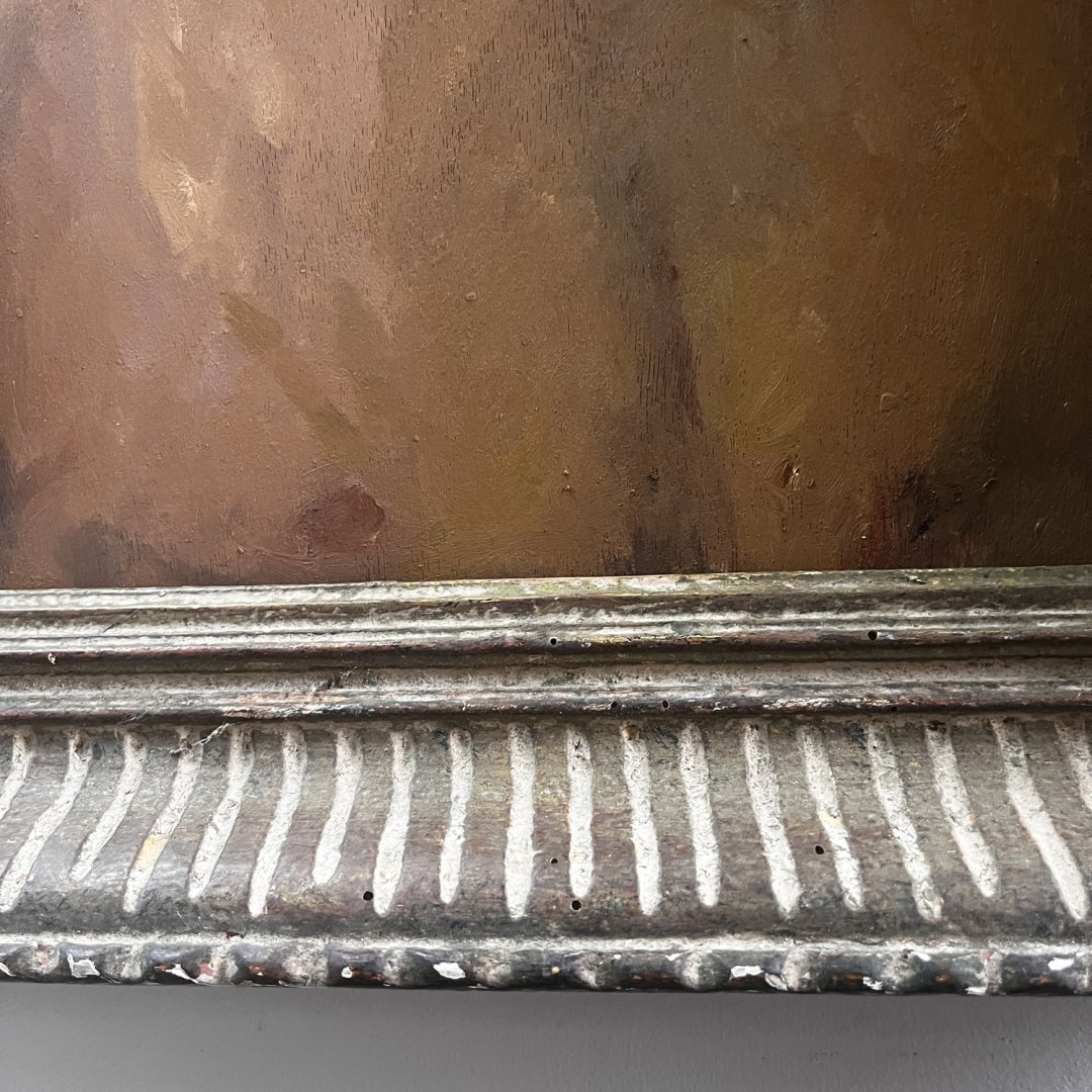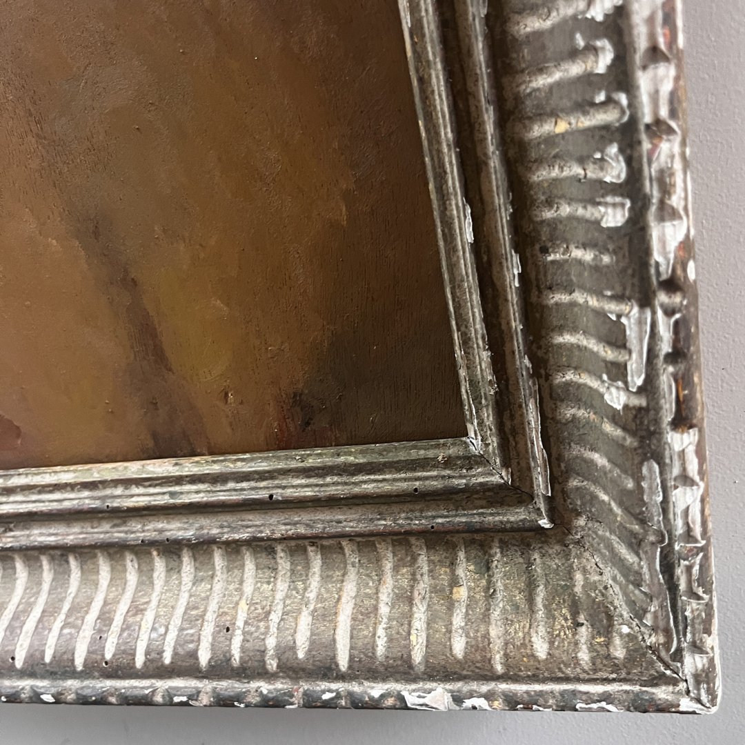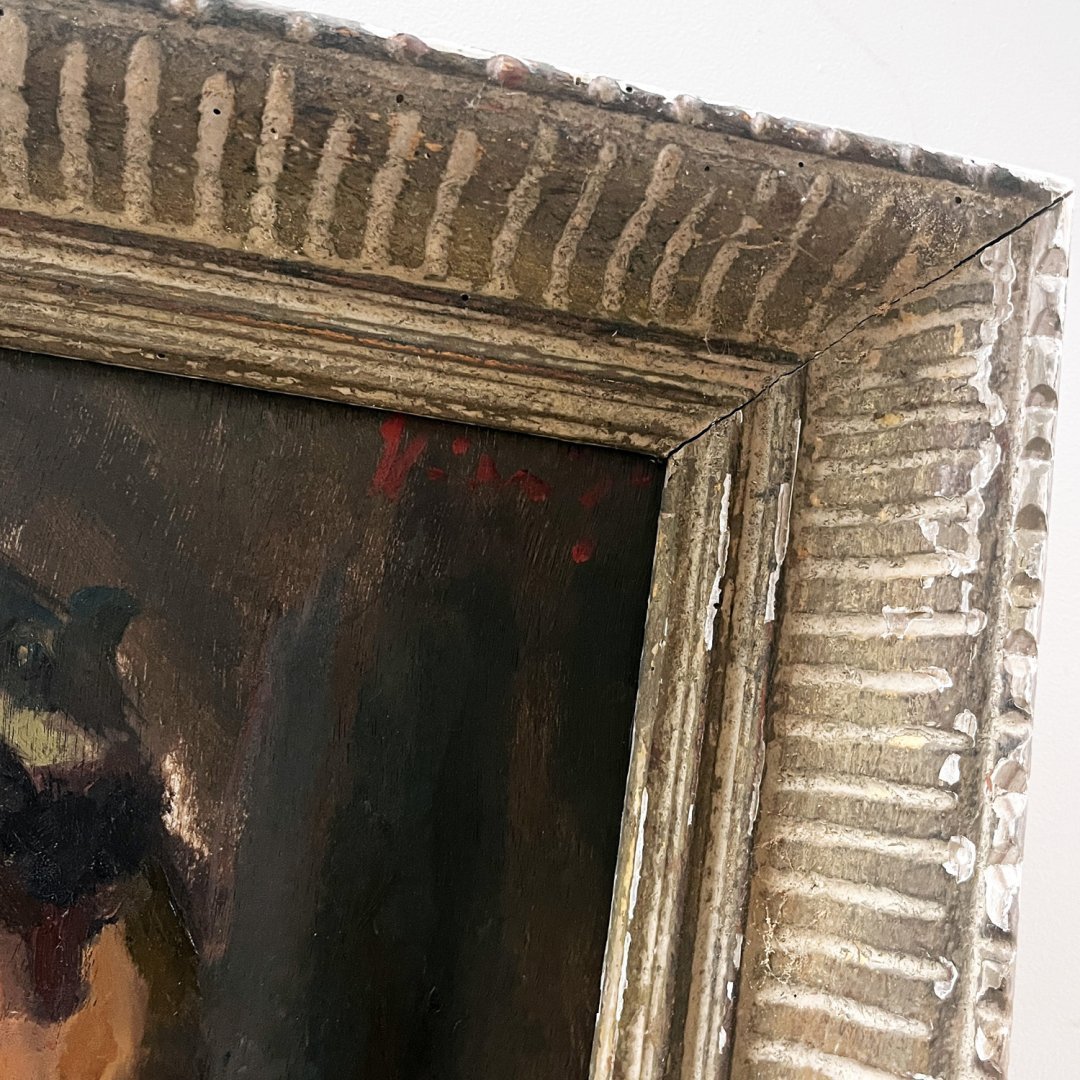 À noter que ce tableau, huile sur bois, est double face comme le précise les photos, il est présenté dans un cadre Montparnasse à canaux en bois sculpté patiné ivoire, contrastant agréablement avec le fond sombre de l’oeuvre. Signature en haut à droite à déchiffrer.