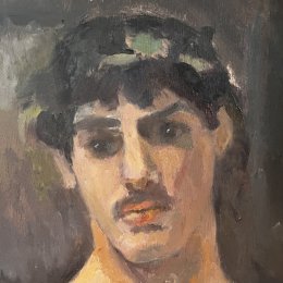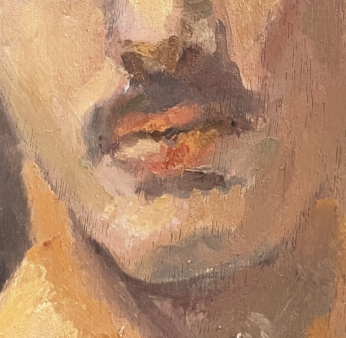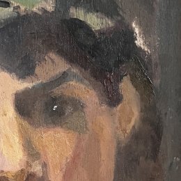 Portrait expressionniste à la physionomie douce et juvénile, à la luminosité portée par un fond sombre très subtilement réalisé en aplats dégradés.