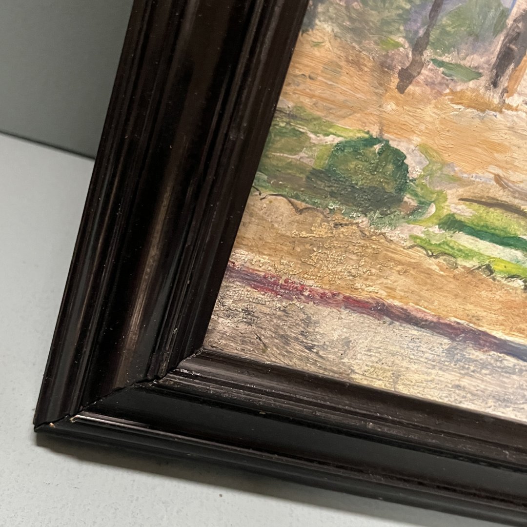 Huile sur panneau, La peinture est en bon état de conservation. Le cadre en bois noirçi encadre l’oeuvre à la manière d’un cliché. À noter quelques éclats sans gravité.