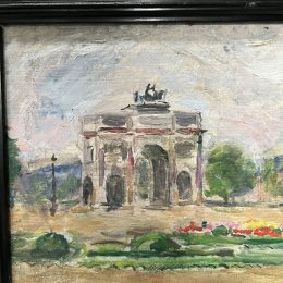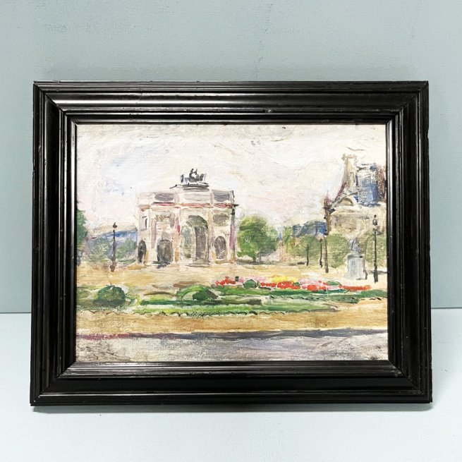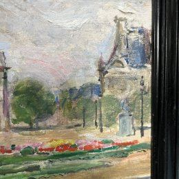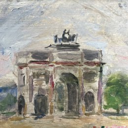 vue iconique de Paris le Louvre et le carrousel encadrant le jardin des Tuileries dans une lumière blanche illuminant la pierre crayeuse typique de ces monuments parisiens ingénieusement rendue par une peinture proche de l’aquarelle.